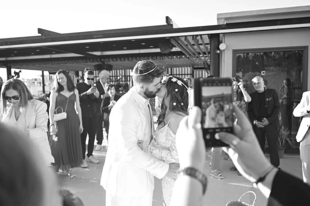 Black and white photo of a wedding ceremony with a couple kissing, surrounded by guests, some taking photos.